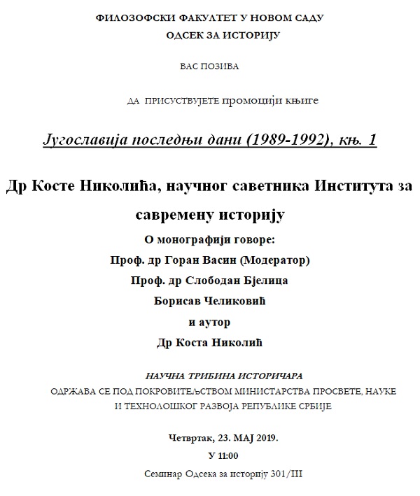 Promocija knjige dr Koste Nikolića, Jugoslavija poslednji dani (1989-1992), knj 1, Beograd 2018, u seminaru Odseka za Istoriju Vreme 21. maj 2019. 14:37 Slike