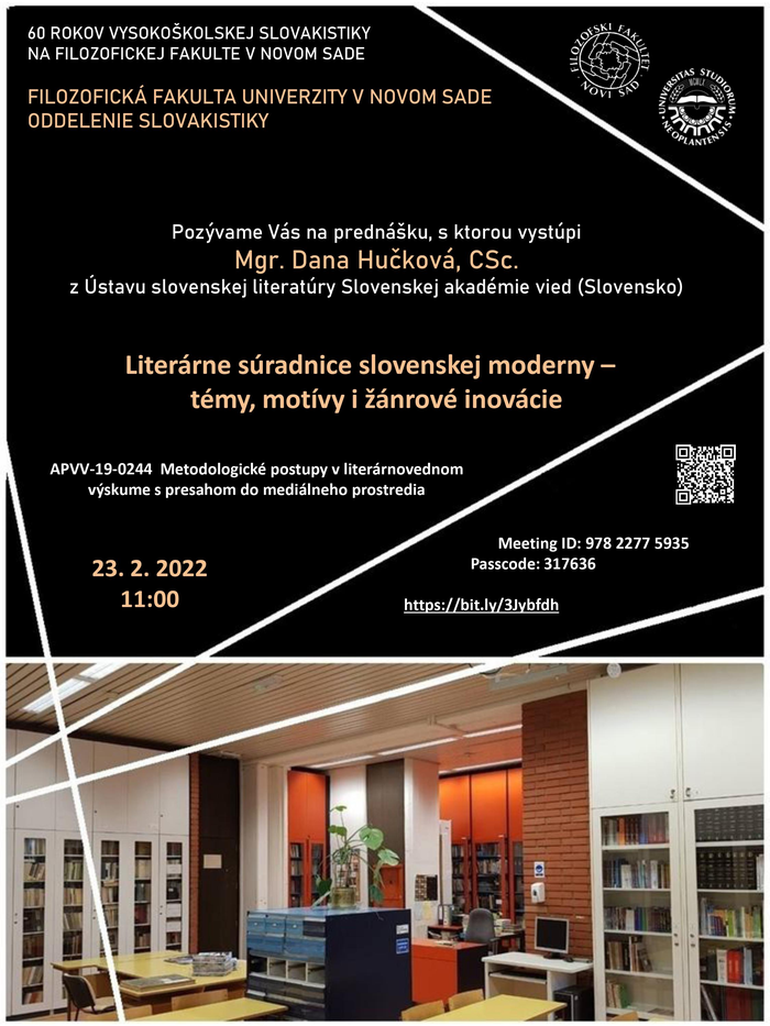 povodom obeležavanja 60. godišnjice visokoškolske slovakistike na Filozofskom fakultetu u Novom Sadu Odsek za slovakistiku Vas poziva na onlajn predavanje dr Dane Hučkove sa Instituta za slovačku književnost Slovačke akademije nauka u Bratislavi (Slovačka republika) – Literárne súradnice slovenskej moderny – témy, motívy i žánrové inovácie (U književnim koordinatama slovačke moderne – teme, motivi i žanrovske inovacije).