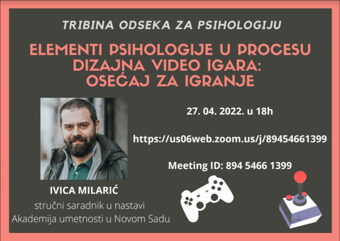 U sredu, 27. 04. 2022. u 18.00 na Zum platformi održaće se tribina Odseka za psihologiju. Gost na tribini biće Ivica Milarić sa Akademije umetnosti u Novom Sadu. Ivica Milarić će govoriti o psihološkim istraživanjima koja se koriste u svrhu dizajniranja video igara