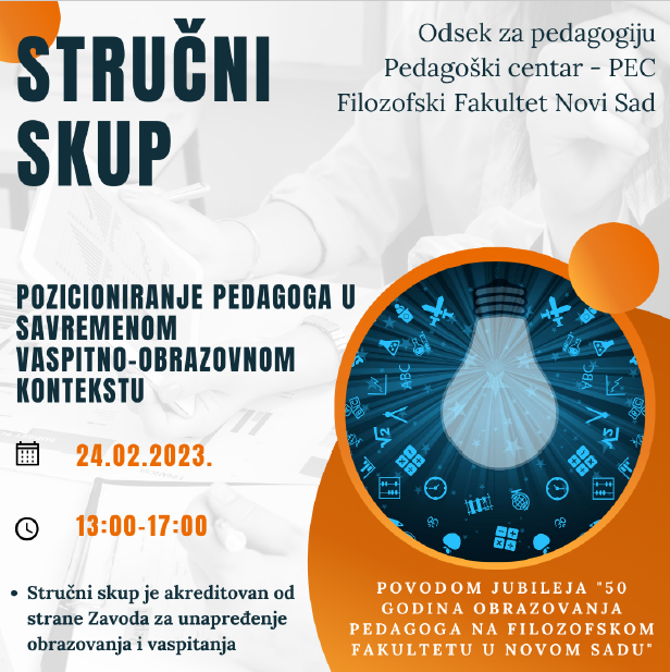 Поводом јубилеја ”50 година образовања педагога на Филозофском факултету у Новом Саду” задовољство нам је да вас обавестимо да Одсек за педагогију Филозофског факултета у Новом Саду и Педагошки центар организују стручни скуп/округли сто на тему „Позиционирање педагога у савременом васпитно-образовном контексту“.