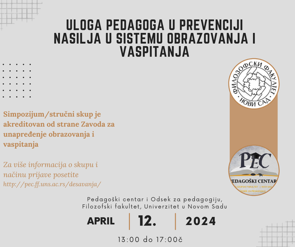 Педагошки центар и Одсек за педагогију Филозофског факултета у Новом Саду организују стручни скуп/симпозијум на тему „Улога педагога у превенцији насиља у систему образовања и васпитања“.