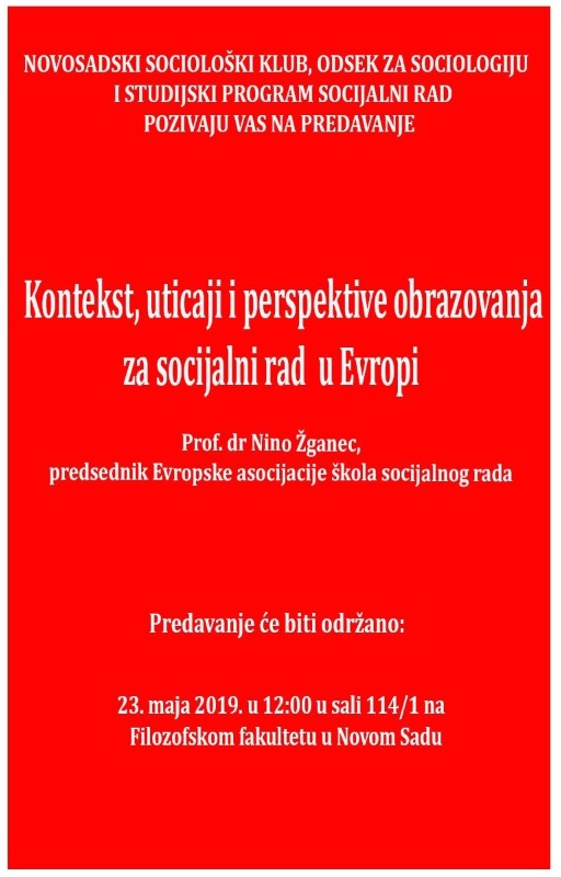 Предавање Контекст, утицаји и перспективе образовања за социјални рад у Европи, проф. др Нино Жганец, 23. мај 2019.Време21. мај 2019. 14:25 Слике