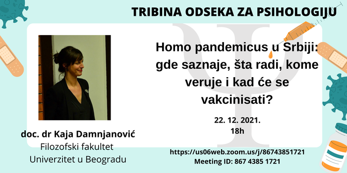 У среду, 22. 12. 2021. у 18ч на Зум платформи одржаће се трибина Одсека за психологију. Гошћа на трибини биће доц. др Каја Дамњановић, научни сарадник на Одељењу за психологију, Филозофског факултета у Београду. Каја Дамњановић ће говорити о карактеристичним понашањима и психолошким реакцијама људи током пандемије COVID-19.