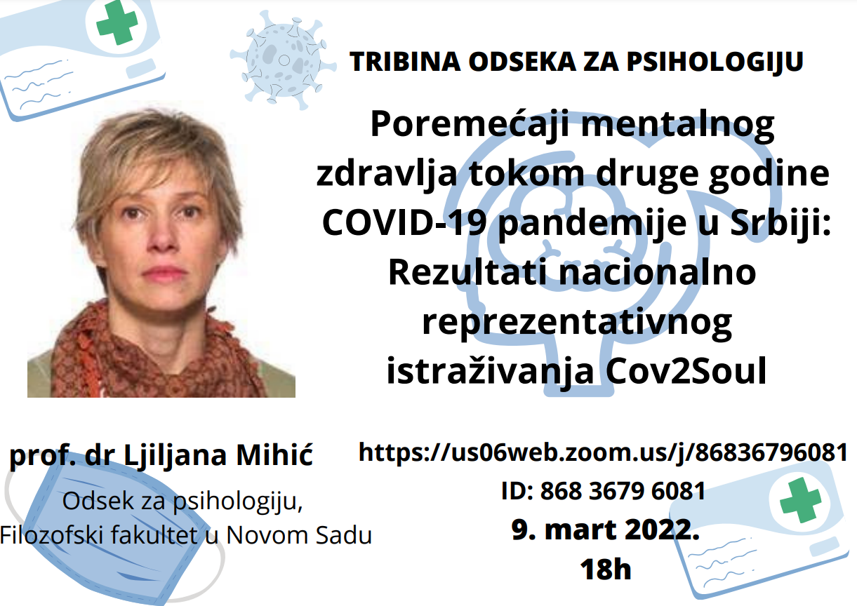 У среду, 09. 03. 2022. у 18.00 на Зум платформи одржаће се трибина Одсека за психологију. Гошћа на трибини биће проф. др Љиљана Михић са Одсека за психологију, Филозофског факултета у Новом Саду. Проф. Михић ће говорити о менталном здрављу у Србији током другог таласа пандемије коронавируса.