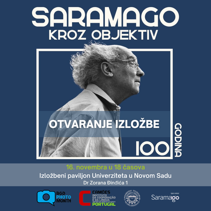 Амбасада Португала у Београду, у сарадњи са фестивалом Београдски месец фотографије, има част да Вас позове да присуствујете отварању изложбе фотографија Сарамаго кроз објектив, организоване поводом стогодишњице од рођења Жозеа Сарамага. Изложба ће бити отворена на рођендан славног португалског писца, добитника Нобелове награде за књижевност 1998. године, у среду, 16. новембра, у 18 часова, у Изложбеном павиљону Универзитета у Новом Саду (Улица др Зорана Ђинђића 1) . Изложбу, која је резултат фото конкурса који је успоставио везу између писчевих дела и маште његових читалаца, отвориће Њ.Е. Виржинија Пина, амбасадорка Португала и Давид Пужадо, директор фестивала Београдски месец фотографије. У овом креативном процесу, који је спојио књижевност и фотографску уметност, учесници су били позвани да кроз објектив забележе своје интерпретације Сарамагових дела. Ако се у књижевности речи претварају у слике, које слике би португалски нобеловац створио широм света? Радове пристигле са четири стране света оцењивао је жири састављен од стручњака за фотографију и Сарамагово дело: Ана Матош – унука Жозеа Сарамага, уметничка директорка Галерије дас Салгадеирас, Клаудио Гарудо – фотограф, уредник и културни продуцент, Давид Пужадо – фотограф и директор Београдског фестивала фотографије и Софија Марињо – професорка протугалског језика при Институту Камоиш и координаторка Центра за португалски језик на Филозофском факултету у Новом Саду. Изложба траје до 24. новембра.