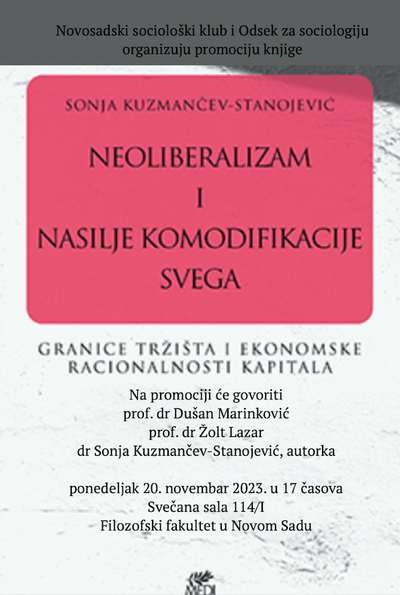 Одсек за социологију и Новосадски социолошки клуб организују промоцију књиге "Неолиберализам и насиље комодификације свега" од ауторке др Соње Кузманчев Станојевић. Промоција ће се одржати у понедељак 20. новембра 2023. у 17 часова у Свечаној сали 114/I на Филозофском факултету у Новом Саду. На промоцији ће поред ауторке говорити проф. др Жолт Лазар и проф. др Душан Маринковић.
