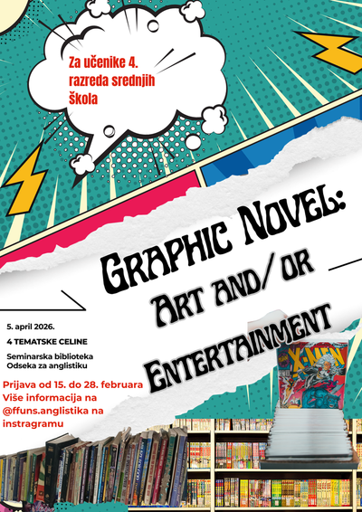 Одсек за англистику Филозофског факултета Универзитета у Новом Саду одржаће 5. априла 2026. једнодневну бесплатну радионицу под насловом „Graphic Novel: Art and/or Entertainment?“ на Филозофском факултету у Новом Саду. Радионица је намењена матурантима и свима који би желели да знају како је то студирати енглески језик и књижевност. Ученицима 4. разреда средњих школа пружићемо прилику да, заједно са нашим студентима 4. године основних студија, учествују у четири интерактивна предавања која ће водити наше професорке Аријана Лубурић Цвијановић, Бојана Вујин, Викторија Кромбхолц и Слађана Стаменковић. Четири индивидуалне сесије трајаће од 11 часова до 16.15 часова (са паузама за кафу и ручак), и понудиће прилику свим љубитељима графичког романа и стрипова да приступе њиховој књижевној анализи.