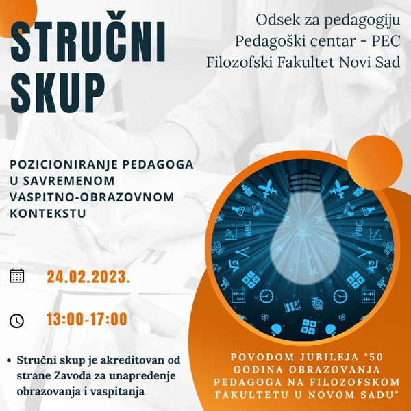 ОпштеПоводом јубилеја “ 50 година образовања педагога на Филозофском факултету у Новом Саду”, Одсек за педагогију и Педагошки центар организују округли сто на тему “Позиционирање педагога у савременом васпитно-образовном контексту”.