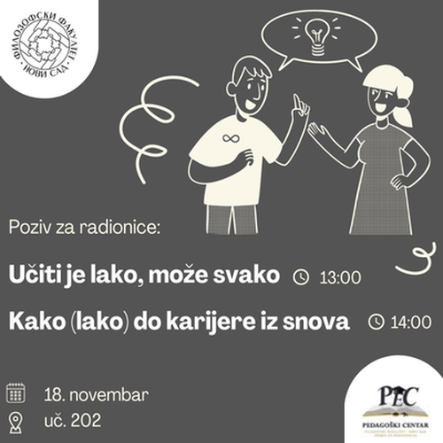 Ученике завршних разреда средњих школа да учествују у две радионице које ће се организовати у оквиру Дана отворених врата, 18. новембра 2023. на Филозофском факултету у Новом Саду. Својим присуством на овим радионицама, ученици ће имати прилику да се упознају са педагогијом као науком и могућим избором свог будућег занимања.
