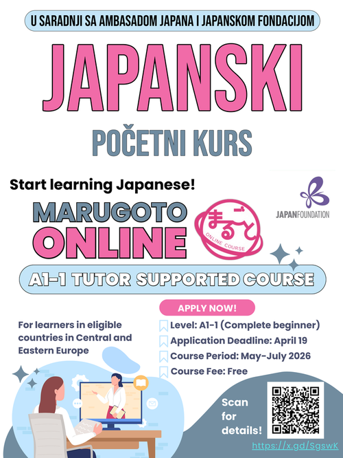 Филозофски факултет, у сарадњи са Амбасадом Јапана у Републици Србији и Јапанском фондацијом, позива Вас на бесплатни почетни курс јапанског језика, онлајн. Пријаве су отворене до 19. априла. Курс подразумева самостални рад и 7 онлајн часова на сваке 2 недеље са наставником Јапанске фондације.