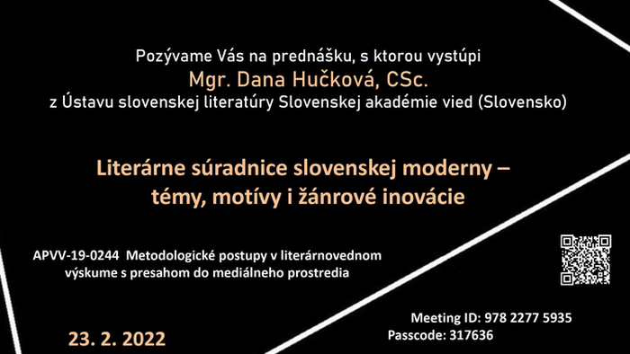 povodom obeležavanja 60. godišnjice visokoškolske slovakistike na Filozofskom fakultetu u Novom Sadu Odsek za slovakistiku Vas poziva na onlajn predavanje dr Dane Hučkove sa Instituta za slovačku književnost Slovačke akademije nauka u Bratislavi (Slovačka republika) – Literárne súradnice slovenskej moderny – témy, motívy i žánrové inovácie (U književnim koordinatama slovačke moderne – teme, motivi i žanrovske inovacije).