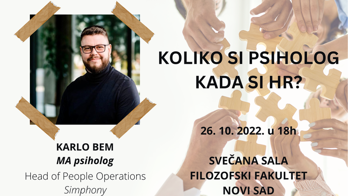 U sredu, 26. 10. 2022. u svečanoj sali Filozofskog fakulteta u Novom Sadu, održaće se tribina Odseka za psihologiju sa početkom u 18.00. Gost na tribini biće Karlo Bem, master psiholog i šef ljudskih resursa u IT kompaniji Simphony. Karlo Bem će govoriti o ulozi psihologa u sektoru ljudskih resursa u okviru IT industrije.