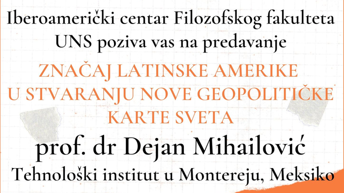 Iberoamerički centar - predavanje prof. dr Dejana Mihailovića Vreme 16. decembar 2022. 12:00 Prezentacija - LATINSKA AMERIKA I AKTUELNA GEOPOLITIČKA SITUACIJA U SAVREMENOM SVETU (pdf) Slike