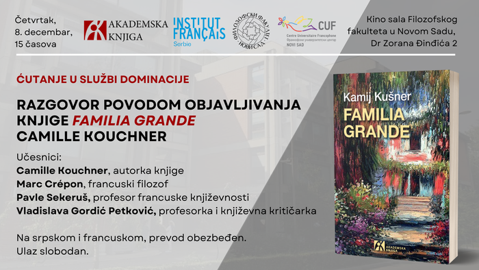 A l'occasion de la publication en serbe du livre Familia Grande de Camille Kouchner (Akademska knjiga, Novi Sad, 2022), nous avons le plaisir de vous inviter à une discussion avec l'auteure organisée à la Faculté de Philosophie et Lettres de l’Université de Novi Sad.