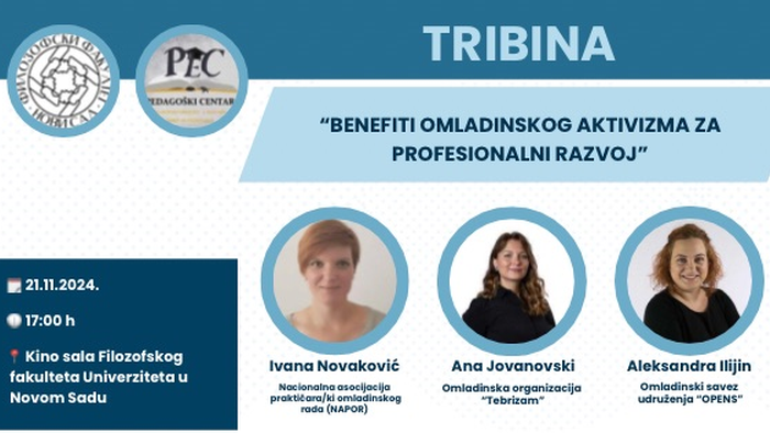 Odsek za pedagogiju i Pedagoški centar Filozofskog fakulteta u Novom Sadu organizuju tribinu pod nazivom „Benefiti omladinskog aktivizma za profesionalni razvoj”. Izlagači na tribini biće Ivana Novaković, programski koordinator u Nacionalnoj asocijaciji praktičara omladinskog rada („NAPOR“), Aleksandra Ilijin, omladinska radnica i koordinatorka programa u Omladinskom savezu udruženja „OPENS“, i Ana Jovanovski, pedagoškinja i predsednica omladinske organizacije „Tebrizam“.