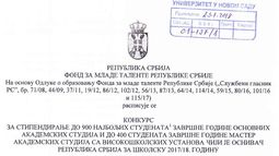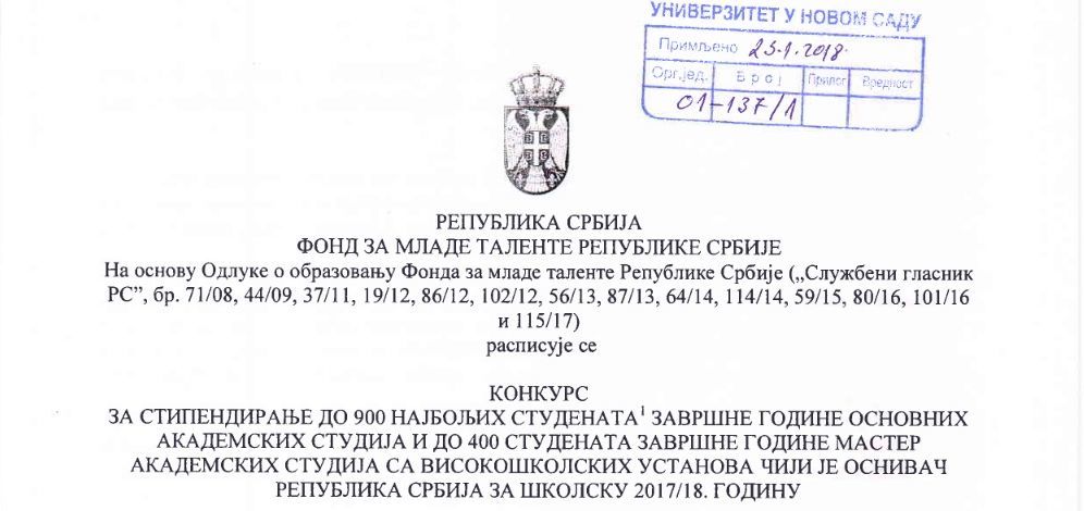 Konkurs za stipendiranje najboljih studenata završne godine osnovnih akademskih studija i završne godine master akademskih studija za školsku 2017/18. 24. januar 2018. 11:00:32Opšte Slike Fajlovi Dopis_ministra_za_sport_i_omladinu_Konkurs.pdf
