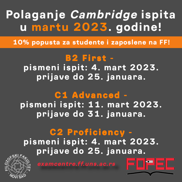 OpšteTestni centar za polaganje ispita Cambridge Assessment English na Filozofskom fakultetu (FOPEC) otvorio je prijave za polaganje ispita u martu 2023. godine.