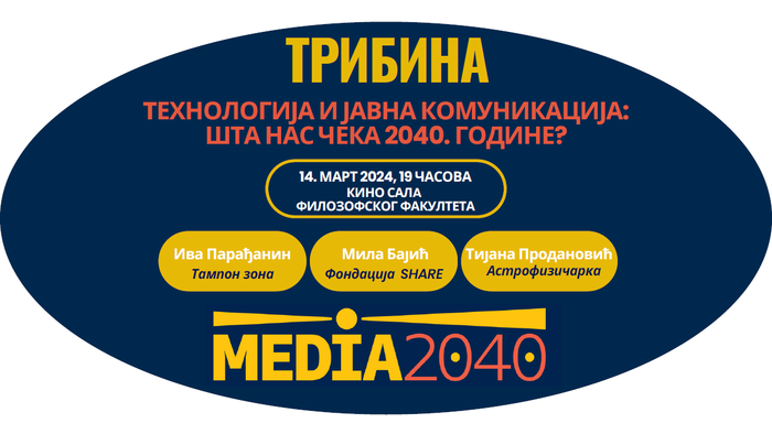 OpšteTribina na temu „Tehnologija i javna komunikacija: šta nas čeka 2040. godine?“ biće održana u četvrtak, 14. 3. 2024. godine u 19 časova (kino-sala Filozofskog fakulteta).