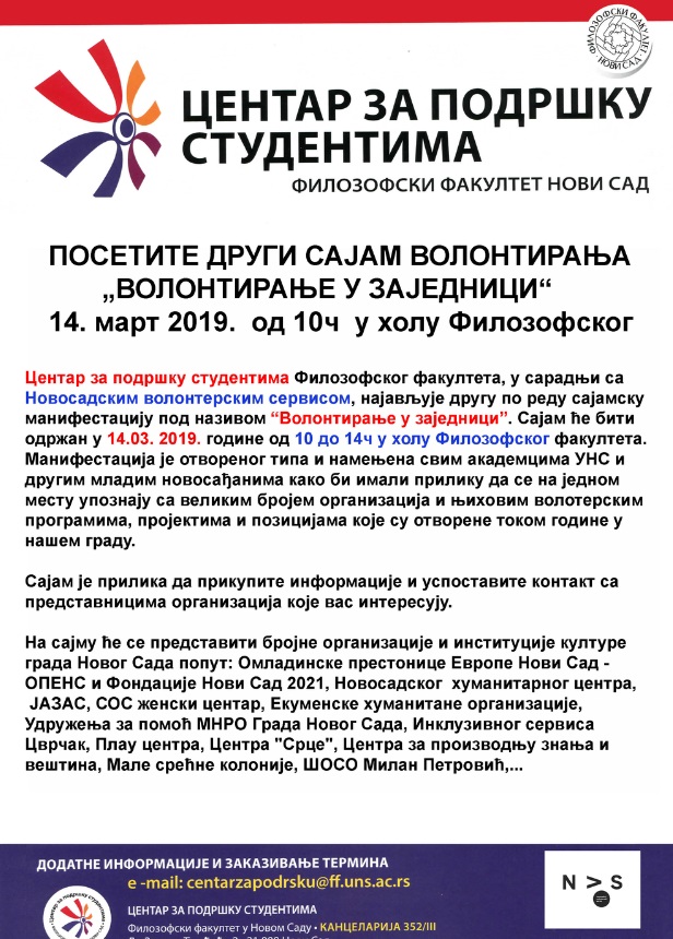 Центар за подршку студентима: Позив за посетиоце II САЈМА ВОЛОНТИРАЊА, 14. март 2019. у 10.00 у холу ФакултетаВреме06. март 2019. 11:39 Слике