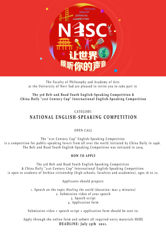 Филозофски факултет и Академија уметности Универзитета у Новом Саду организују Треће омладинско такмичење под називом The 3rd Belt and Road Youth English-Speaking Competition & China Daily “21st Century Cup” International English-Speaking Competition.
