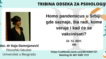 У среду, 22. 12. 2021. у 18ч на Зум платформи одржаће се трибина Одсека за психологију. Гошћа на трибини биће доц. др Каја Дамњановић, научни сарадник на Одељењу за психологију, Филозофског факултета у Београду. Каја Дамњановић ће говорити о карактеристичним понашањима и психолошким реакцијама људи током пандемије COVID-19.