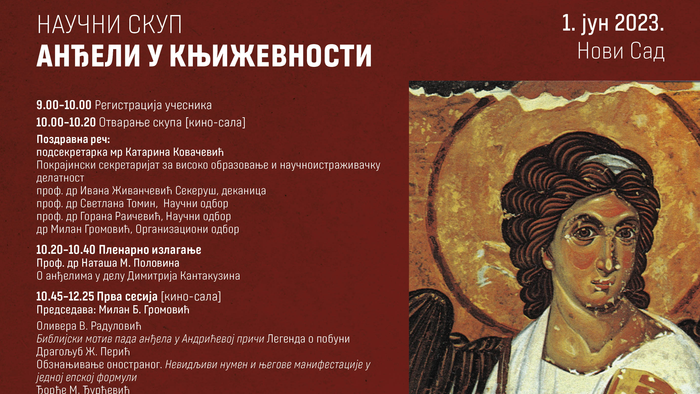 У четвртак, 1. јуна 2023. године, на Филозофском факултету Универзитета у Новом Саду у организацији Одсека за српску књижевност у сарадњи са научно-културним удружењем ,,Битије" биће одржан научни скуп ,,Анђели у књижевности". Позивамо заинтересоване колеге и студенте да подрже отварање скупа у 10.00 часова у Кино-сали Филозофског факултета. Пленарно предавање и сесије отвореног су типа и сви заинтересовани су добродошли. Финансирање одржавања скупа и штампања зборника радова подржао је Покрајински секретаријат за високо образовање и научноистраживачку делатност.