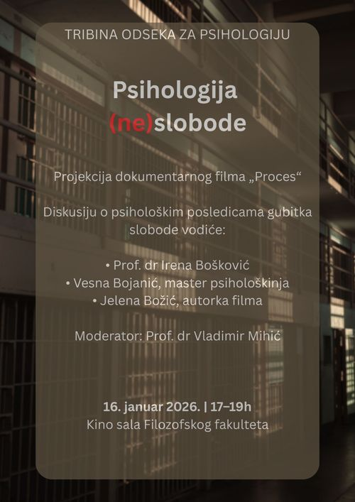 Одсек за психологију Филозофског факултета организује трибину „Психологија (не)слободе“, у петак 16. јануара 2026. од 17 до 19ч, у Кино Сали Филозофског факултета.