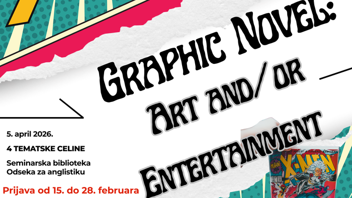 Одсек за англистику Филозофског факултета Универзитета у Новом Саду одржаће 5. априла 2026. једнодневну бесплатну радионицу под насловом „Graphic Novel: Art and/or Entertainment?“ на Филозофском факултету у Новом Саду. Радионица је намењена матурантима и свима који би желели да знају како је то студирати енглески језик и књижевност. Ученицима 4. разреда средњих школа пружићемо прилику да, заједно са нашим студентима 4. године основних студија, учествују у четири интерактивна предавања која ће водити наше професорке Аријана Лубурић Цвијановић, Бојана Вујин, Викторија Кромбхолц и Слађана Стаменковић. Четири индивидуалне сесије трајаће од 11 часова до 16.15 часова (са паузама за кафу и ручак), и понудиће прилику свим љубитељима графичког романа и стрипова да приступе њиховој књижевној анализи.