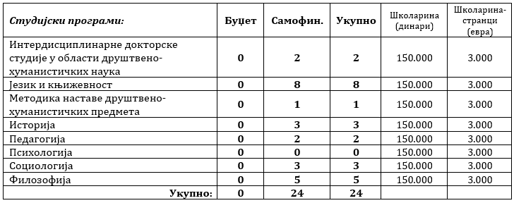 Редослед кандидата за упис на прву годину докторских студија утврђује се у складу са ПРАВИЛНИКОМ О УПИСУ КАНДИДАТА на студијске програме које реализује Филозофски факултет, Правилником о докторским студијама и стицању научног назива доктора наука Филозофског факултета у Новом Саду и акредитованим студијским програмом.