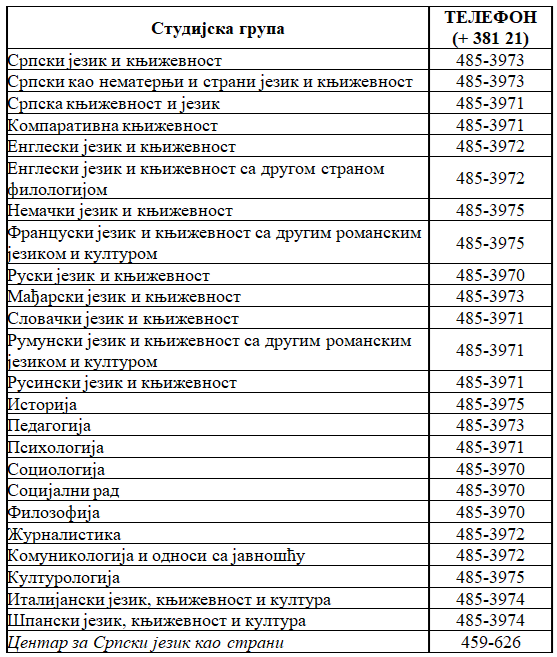 Студентска служба: +381 21 485 3976 и +381 21 450 628