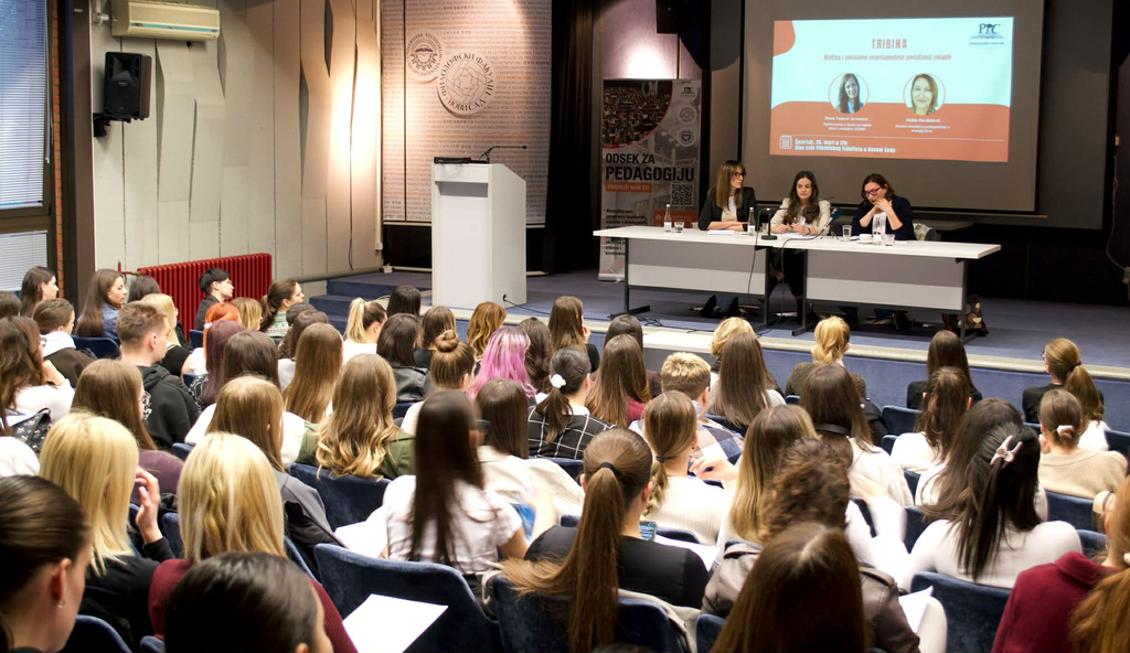 Део атмосфере са трибине „Ризична и социјално неприлагођена понашања младих“ која је одржана 26. марта на Филозофском факултету, у организацији Одсека за педагогију и Педагошког центра (ПЕЦ). Захваљујемо се излагачицама Стани Тодорић Јовановић и Мелити Ранђеловић на несебичној подели знања и искуства из ове области, као и посетиоцима трибине на занимљивим питањима и конструктивној дискусији.